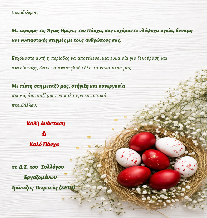 Το Διοικητικό Συμβούλιο του Συλλόγου Εργαζομένων Τράπεζας Πειραιώς, καλεί όλα τα μέλη του, στην ΕΤΗΣΙΑ ΤΑΚΤΙΚΗ ΓΕΝΙΚΗ ΣΥΝΕΛΕΥΣΗ, η οποία θα πραγματοποιηθεί στις 8 Απριλίου 2026 ημέρα Τετάρτη και ώρα 12:00 στα γραφεία του Συλλόγου μας, Καραγεώργη Σερβίας 2 και Σταδίου, με αποκλειστικά θέματα ημερήσιας διάταξης τα παρακάτω: